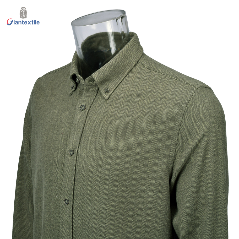 Men's Shirt 100% Cotton Long Sleeve Solid Green Casual Herringbone Shirt For Men